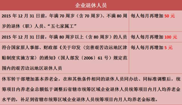 适当提高部分退休人员基本养老金1、2015年12月31日前年满70周岁的退休人员,在上述两项调整的基础上每人每月再增加50元。